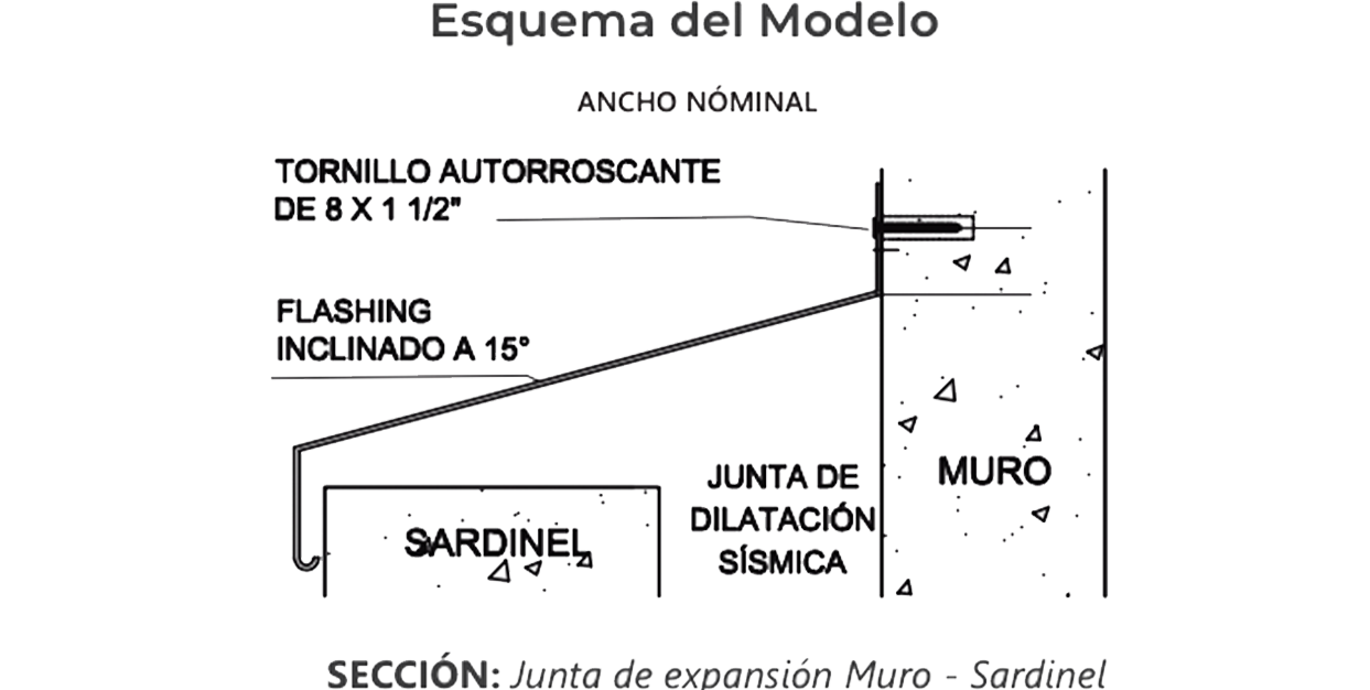 La Tapajunta de Dilatación Sísmica TFI (Tipo Flashing Inclinado) de fabricación de ACEROS Y MOLDURAS S.A.C ha sido diseñada para la protección de las juntas de dilatación sísmica en azoteas, encuentros de juntas de sardinel – muro, En su aplicación permanece uno de los lados de la tapajunta fija mediante un tornillo y tarugo permitiendo el desplazamiento de la misma.