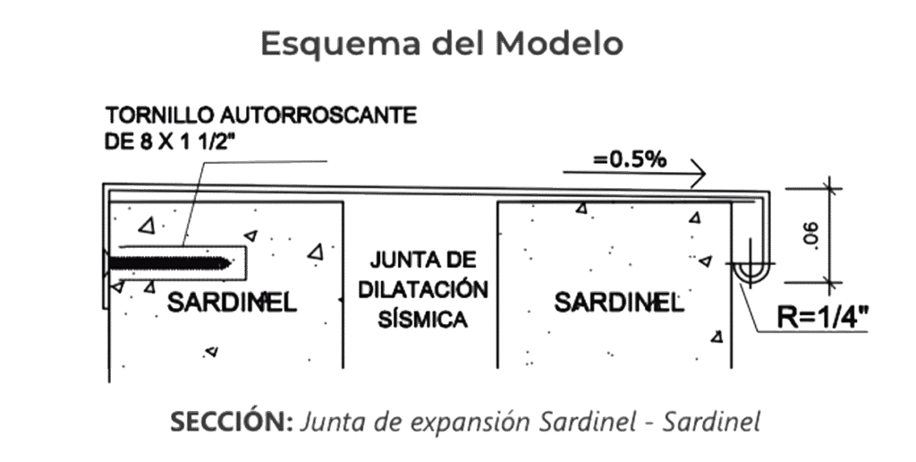 La Tapajunta de Dilatación Sísmica TFU (Tipo Flashing U) de fabricación de ACEROS Y MOLDURAS S.A.C ha sido diseñada para la protección de las juntas de dilatación sísmica en azoteas, encuentros de juntas de sardinel – sardinel. En su aplicación permanece uno de los lados de la tapajunta fija mediante un tornillo y tarugo permitiendo el desplazamiento de la misma.