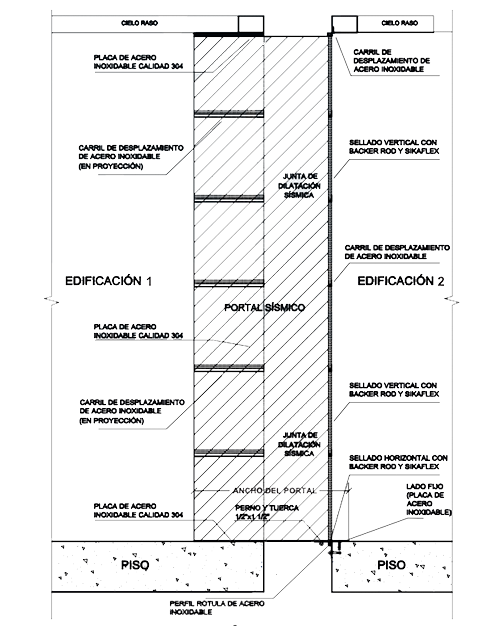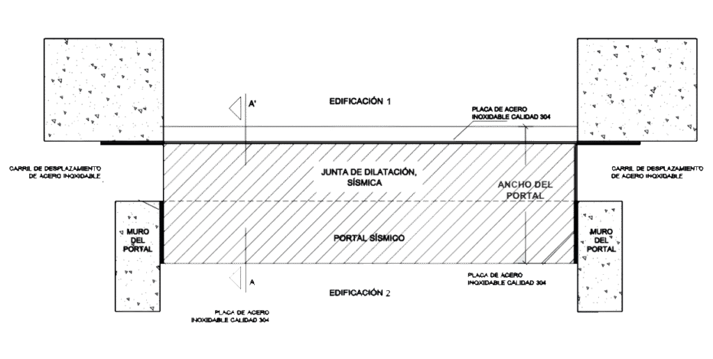 El Portal Sísmico (AYM-SP) es una solución compleja y versátil, compuesta por acero inoxidable calidad 304, que cumple con la norma ASTM E-1399. Es ideal para juntas en corredores, pasarelas, puentes y conexiones entre dos edificaciones incluso con aislamiento sísmico.